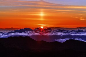 Privelistea rasaritului la craterul Haleakala, din inima parcului national Haleakala este o traire magica. Magicaaaaa, va zic! Culorile craterului, o combinatie de ruginiu cu negru, verde si maro, incep parca sa danseze la rasarit si sa imprumute de la soare nuante aproape nepamantesti si totul parca se invaluie in lumina aurie a noii zile. Am prins si un plafon de nori, care as fi jurat ca sunt creati din vata de zahar si un soare imens, imens, imens se arata, din ce in ce mai curajos la orizont. Te simti mic ca o furnica in acea imensitate a cerului, dar, in acelasi timp, esti atat de plin de energie, incat iti vine sa zbori nu alta!
