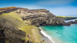 Inainte sa plec de pe Big Island am ajuns si la plaja cu nisip verde Papakolea. Cum era sa ratez o asa raritate a naturii!? O plaja ce adaposteste miliarde de cristale verzi, numite olivines. Nu este chiar la o aruncatura de bat, e nevoie de un hike de vreo doua ore, in plin soare si fara nicio frunzulita care sa faca umbra. E posibil ca pentru unii sa nu fie chiar apetisant, dar mie mi-a placut. Era aproape pustie, doar vreo cateva suflete ratacite si ele pe acolo.